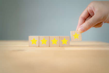 The customer's hand put wooden blocks with a five yellow star symbol, evaluation, increase rating, Customer experience, satisfaction and best excellent services rating concepts.