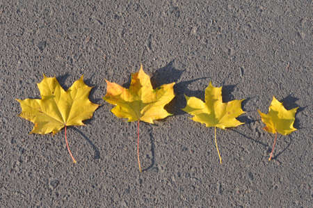 Autumn creative composition. Yellow fallen leaves in a row on the pavement. Autumn background