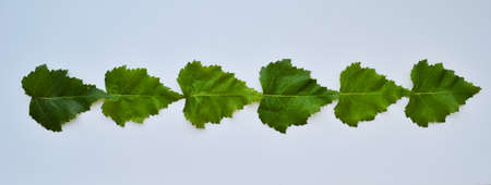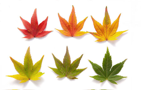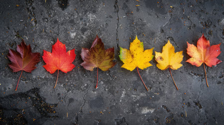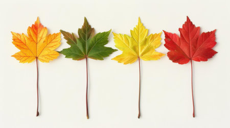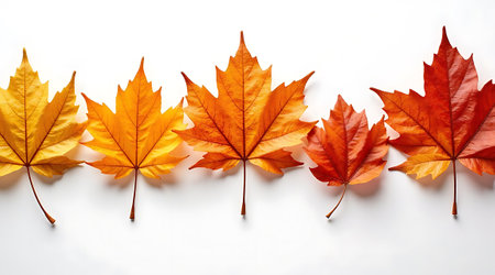 Vibrant autumn leaves in shades of yellow orange and red are arranged in a line on a light background The leaves showcase the seasonal transition capturing the essence of fall with their rich colors and varying sizes reflecting nature's beauty