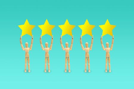 Customer Feedback Concept : Wooden model toys holding yellow star for best service ranking.