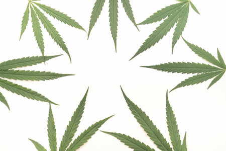 Top view of green cannabis leaves isolated on white background. Alternative medicine. Growing organic cannabis herb on the farm. Marijuana plantation for medical concept.
