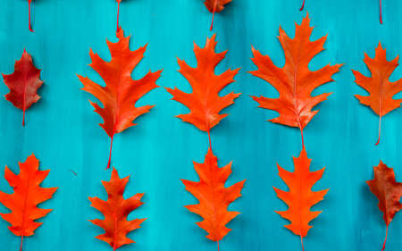 Colorful maple leaves arranged on a blue background showcasing autumn foliage and seasonal nature details.