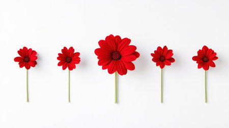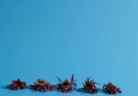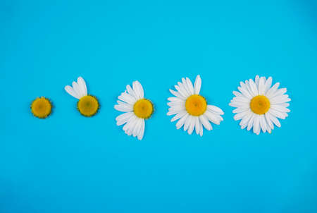 Five chamomile flowers lie horizontally in a row on a blue background, each next chamomile missing more and more petals, the lower chamomile has no petals