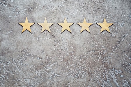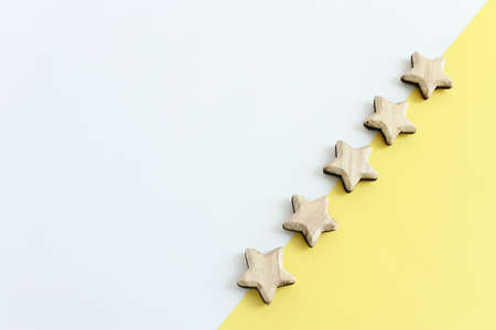 five wooden stars arranged in row on a neutral beige textured cement background, top view with copy space. Best rating customer feedback concept.