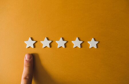 Five star review customer feedback satisfaction experience, online rating system for quality service business success, white stars symbolize high ranking achievement on plain background.