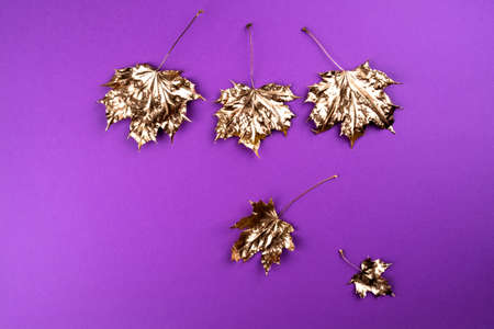 Autumn composition. Golden maple leaves on purple background. Autumn, fall concept. Flat lay, top view, copy space