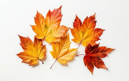 Generative AI : Set of dry colorful natural curved autumn maple leaves in yellow orange burgundy colors on white background with light shadow side view