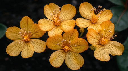 Overhead view of perfect Cassia flower symmetry against dark soil background, botanical specimen style