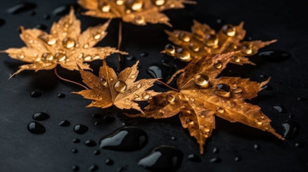 Golden maple leaves in water drops on a background of polished black stone top view, gold and stone. Generative AI