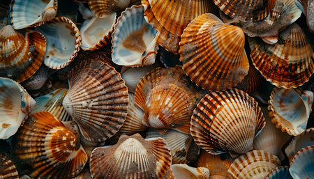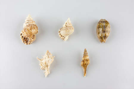 Assortment of natural sea shells with diverse textures. Home decor item. sea shells in a pile closeup, empty washed shells of sea mollusks. High quality photo
