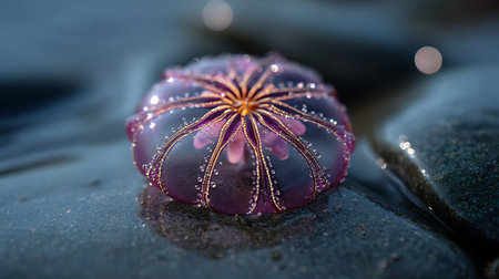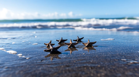 A serene scene of six starfish resting on a sandy beach shore, with gentle ocean waves rolling in under a clear blue sky at sunset.
