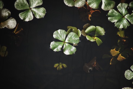 Fallen Orange Maple Leaves Floating On Dark Water Surface With Ripples In Autumn Rainy Day