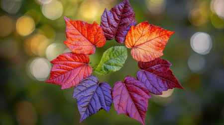 A wreath made of colorful autumn leaves in various shades of red, orange, and purple is displayed against an out-of-focus background. The leaves form the shape of a circle with one leaf at its center. This scene symbolizes fall's beauty and diversity, as well as nature's changeable essence. High-resolution photography, detailed photo, natural light, high-quality picture. --chaos 30 --ar 16:9 --v 6.1 Job ID: 5ef137a4-0778-4cf5-9e00-c801f738357f