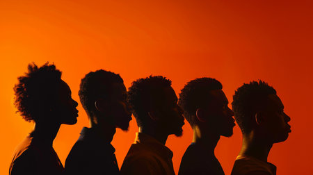 Four young adults holding large star-shaped boards with faces, against a multi-colored brick wall