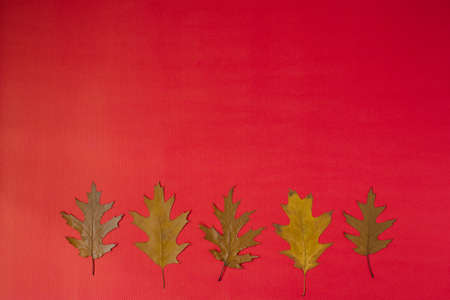 Herbarium. autumn yellow leaves on a red background. Copy space