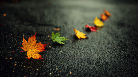 A serene scene of colorful autumn leaves on wet pavement, showcasing vivid hues of orange, yellow, and green in a tranquil atmosphere.