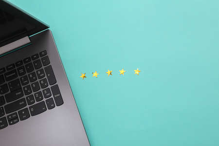 Excellent online service. Laptop with five gold stars on a blue background. top view
