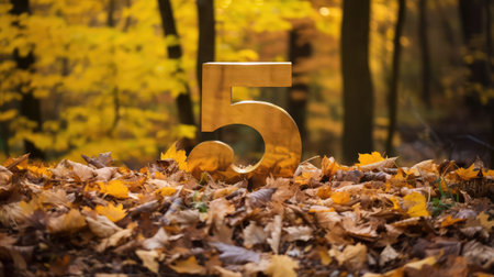 A vibrant assortment of autumn leaves in various shades of red, orange, and green creatively arranged to shape the number five, showing the beauty of fall foliage.