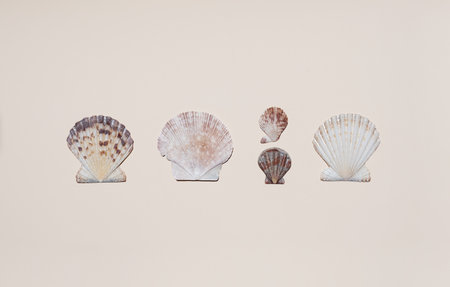 This image showcases a stunning collection of colorful scallop shells arranged in a line against a clean white background, ideal for nature and marine-themed projects.
