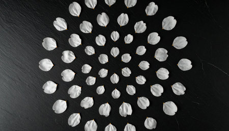 cherry blossom petals arranged in a Mandala pattern on black marble