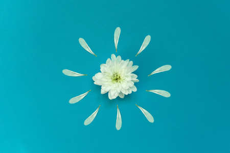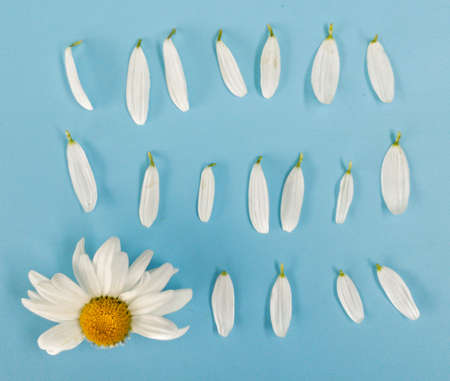 Chamomile flower and petals isolated on turquoise surface. Guess on daisy. Poster design element.