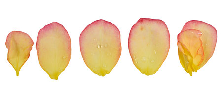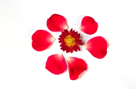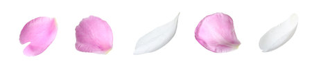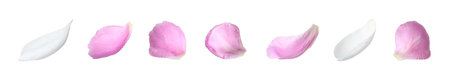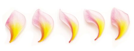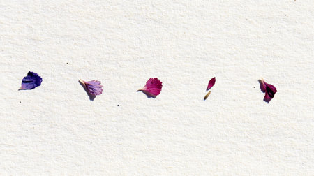 Line of flower petals are scattered across a white background. The petals are of different colors and sizes, creating a sense of movement and life. The image evokes a feeling of natural beauty