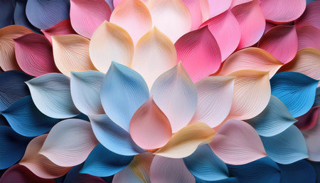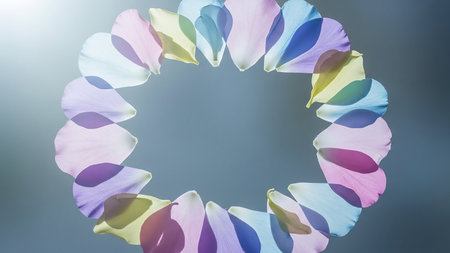 Circle showing circle of translucent pastel colored flower petals arranged in a ring with soft light creating a gentle gradient of pink purple blue and yellow hues...