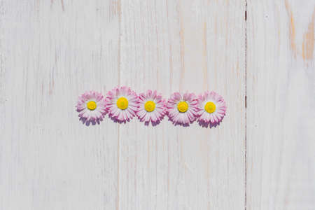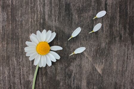 Divination on chamomile. Single daisy with torn off petals on wooden background with copy space.