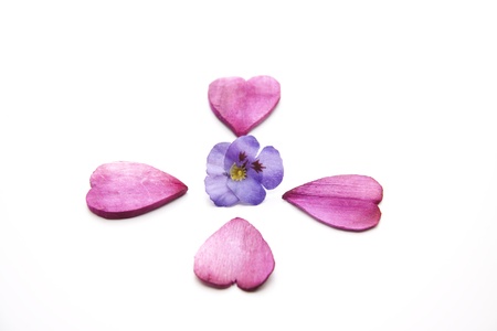 Vibrant purple pansy flower centered on a white background, surrounded by scattered delicate petals. represents beauty, spring, and natural elegance.