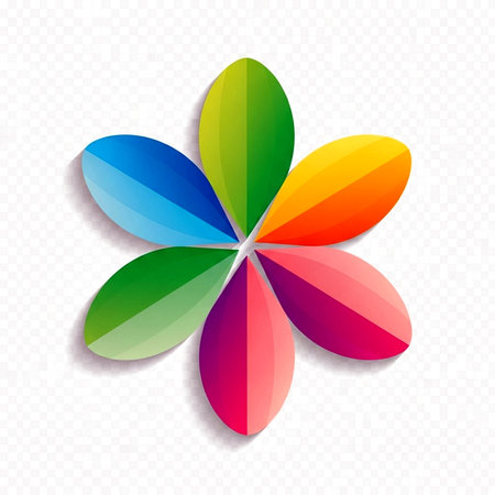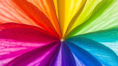 A beautiful circular arrangement of flower petals displays a full spectrum of vibrant rainbow colors, creating a visually stunning and inviting abstract background.