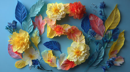a vibrant flat lay composition featuring colorful flowers, leaves, and the number six arranged in a layout, captured from a top-view perspective for an eye-catching display