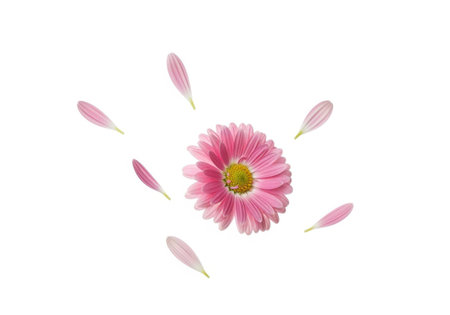 A vibrant pink gerbera daisy with a yellow center, surrounded by scattered, delicate falling petals against a clean white backdrop.