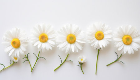 Four Fresh White Daisies with Yellow Centers Isolated on a White Background, Copy Space