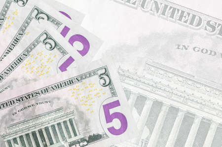 5 US dollars bills lies in stack on background of big semi-transparent banknote. Abstract business background with copy space