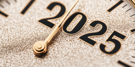 A close-up view of a clock part featuring the year 2025, symbolizing the upcoming new year. The clock's hands are poised to signify a significant moment. The background is decorated with glitter, adding a festive touch. This design reflects the excitement and anticipation associated with New Year celebrations.
