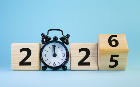 2026 New Year symbol. Businessman turns wooden cube and changes Year 2025 to 2026. Beautiful gray background with Alarm clock. Copy space. Business and 2026 new year concept