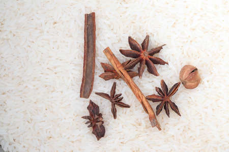 Star anise, cinnamon sticks and cardamom on a wooden surface, background.