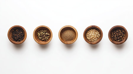 This image showcases various spices and seeds displayed in wooden bowls on a clean white background, perfect for culinary themes and food-related projects.