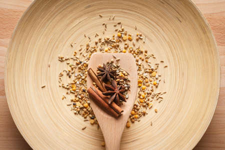 mix of Asian Indian dry herbs for alternative medicine or aromatherapy and food flavouring ingredient lay topview on wooden background.