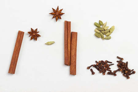 Cinnamon sticks, cardamom and cloves on white background. Flat lay. Copy space