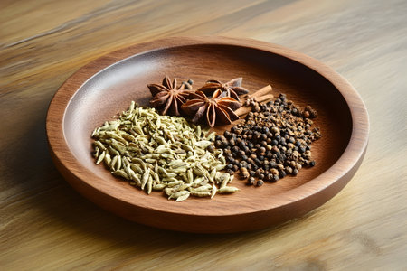 Colorful spices arranged artistically on a wooden plate awaiting culinary exploration and inspiration.