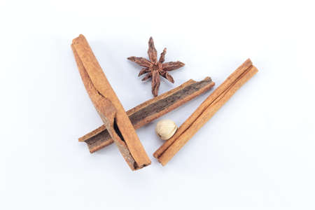 Isolated Chinese dried spice for Asian food as cinnamon stick , Thai Cardamon, Star anise, the image on white background, front view, low angle view.