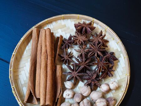 Top view of dried herbs and spices with star anise (badiane), cinnamon sticks, amomum testaceum or siam cardamom on bamboo weave basket on wooden table.
