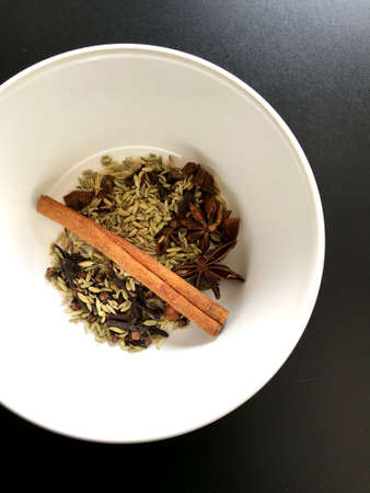 Food concept mix of masala spices, cinnamon, fennel, star anise, coriander seed and cinnamon pods in copper cup on black slate board
