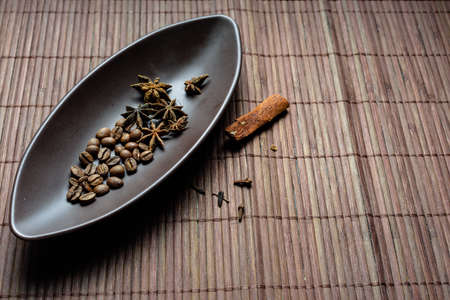 Brown canoe-shaped dish on bamboo mat with coffee beans, star anise, cloves and cinnamon.