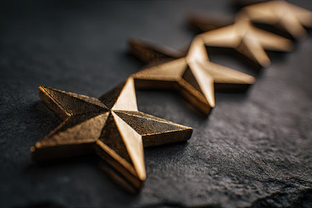 This image showcases a series of metallic stars arranged in a line against a textured, dark backdrop. The composition features a shallow depth of field, emphasizing the foreground object. The golden color and detailed texture suggest luxury and prestige. Suitable for a range of commercial applications, including promotional materials.