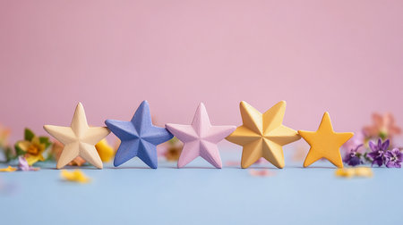 Colorful textured stone stars arranged evenly on a pale neutral background, perfect for creative rating or review designs with natural material feel