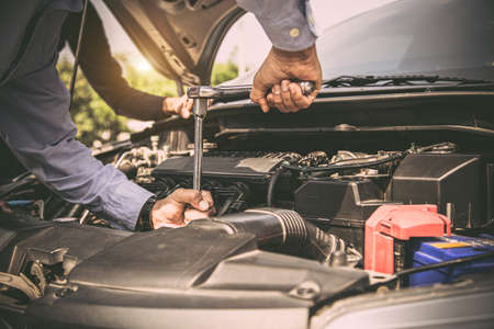A man checking the auto engine, uses a wrench to fix the car engine,repair service.
