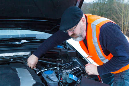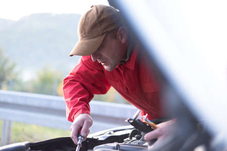 Emergency roadside assistance, road assistance worker in uniform trying to fix car breakdown or engine failure. Roadside assistance concept