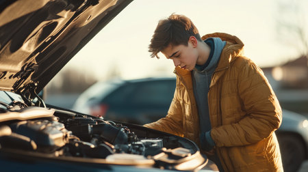 A teenager standing beside an open car hood, carefully examining the engine with curiosity and focus, bright daylight.